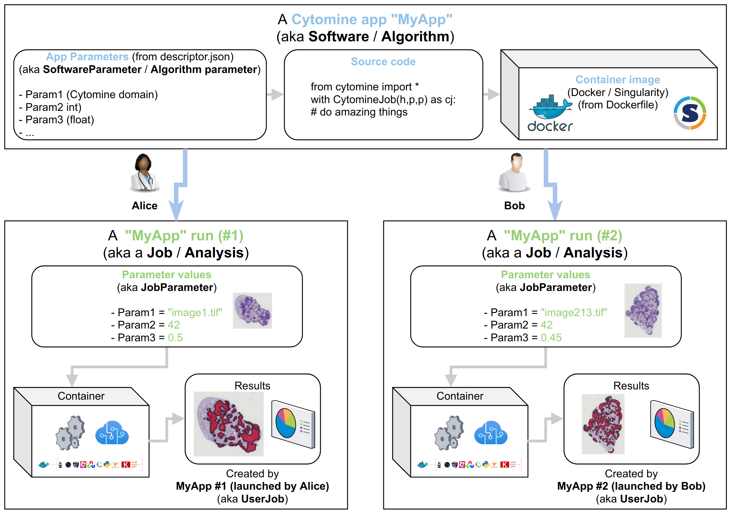 In Cytomine HTTP API, Cytomine app executions are called Job. The parameters and their values are called JobParameter. Output data is owned by a UserJob.